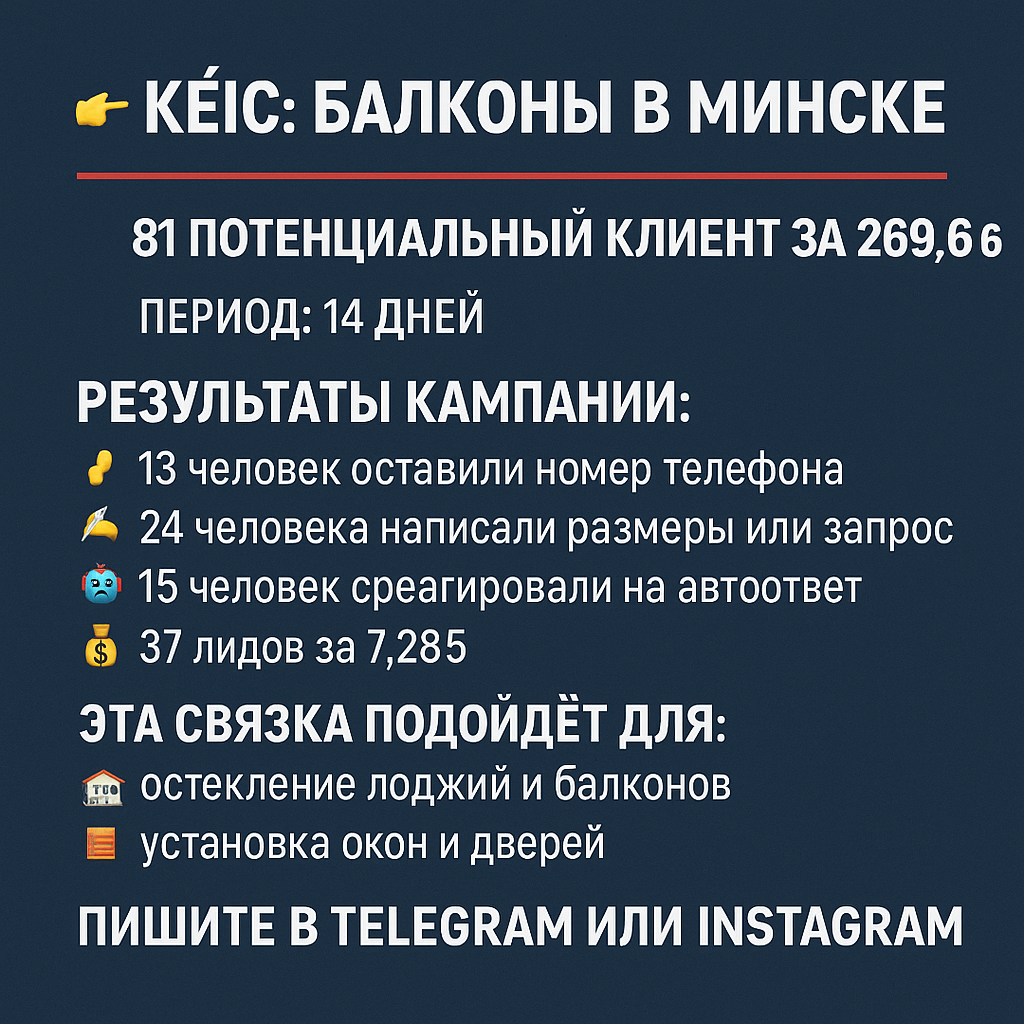 📦 Кейс: Как привлечь Лидов по 5,18$ - 7,28$ на остекление и отделку балконов с бюджетом 269,66$ в Минске за 14 дней.